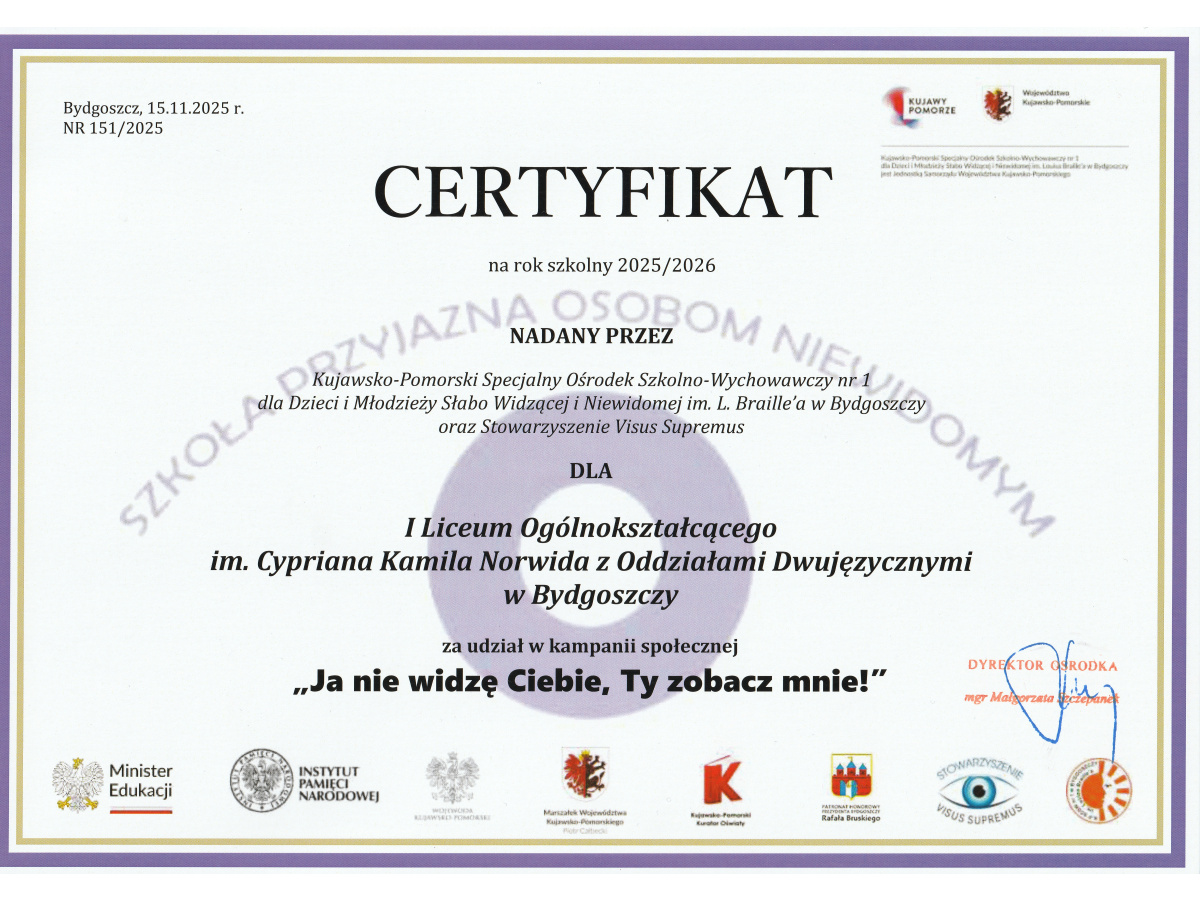 W październiku nasza szkoła włączyła się w kampanię społeczną z okazji Międzynarodowego Dnia Białej Laski „Ja nie widzę Ciebie, Ty zobacz mnie!” 2025. Za podjęte działania i zaangażowanie otrzymaliśmy Certyfikat Szkoły Przyjaznej Osobom Niewidomym.