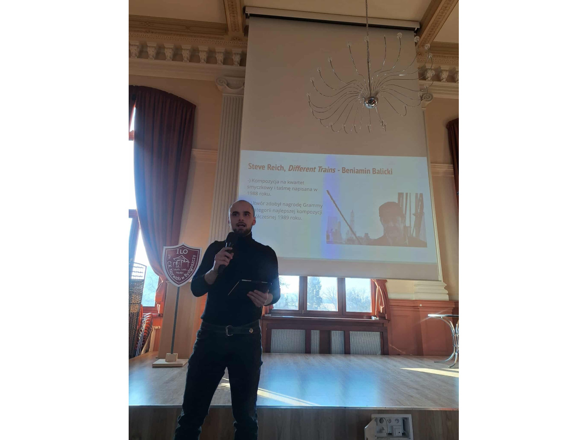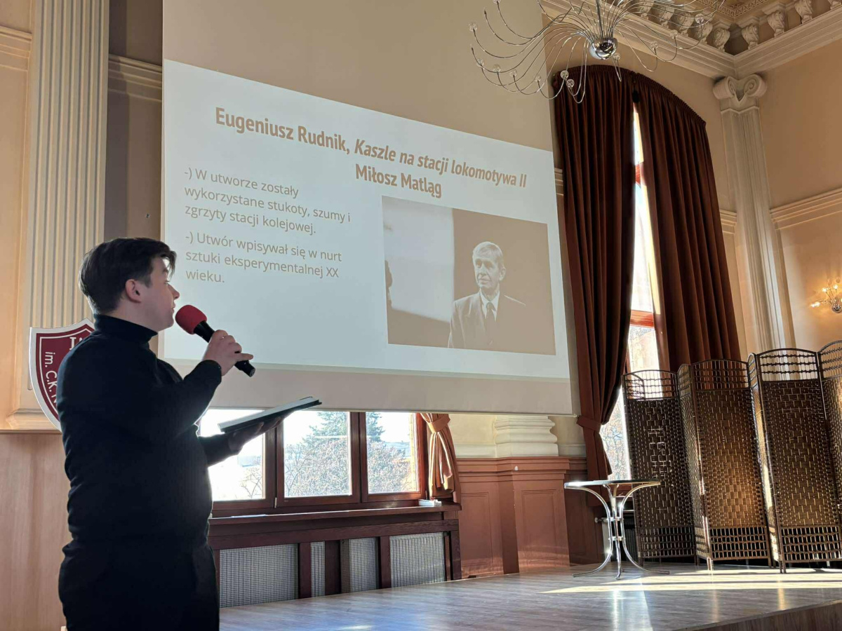 Podczas spotkania uczniowie uczestniczyli w prelekcji historyczno-muzykologicznej poświęconej związkom muzyki z rozwojem kolei – od pierwszej podróży pasażerskiej z 1825 roku na trasie Shildon–Darlington–Stockton po współczesne interpretacje tego fenomenu w kulturze i sztuce. Prelekcja ukazała, jak postęp technologiczny inspirował kompozytorów XIX i XX wieku.