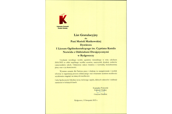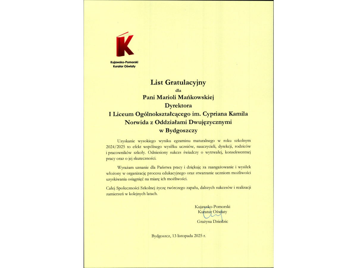 13 listopada 2025 r. Kujawsko-Pomorski Kurator Oświaty Pani Grażyna Dziedzic nagrodziła dyrektorów szkół ponadpodstawowych z najlepszymi wynikami maturalnymi w roku szkolnym 2024/2025, wśród których znalazła się Pani Dyrektor I LO Mariola Mańkowska. Podczas uroczystości listy gratulacyjne odebrało 7 dyrektorów liceów i 7 dyrektorów techników.