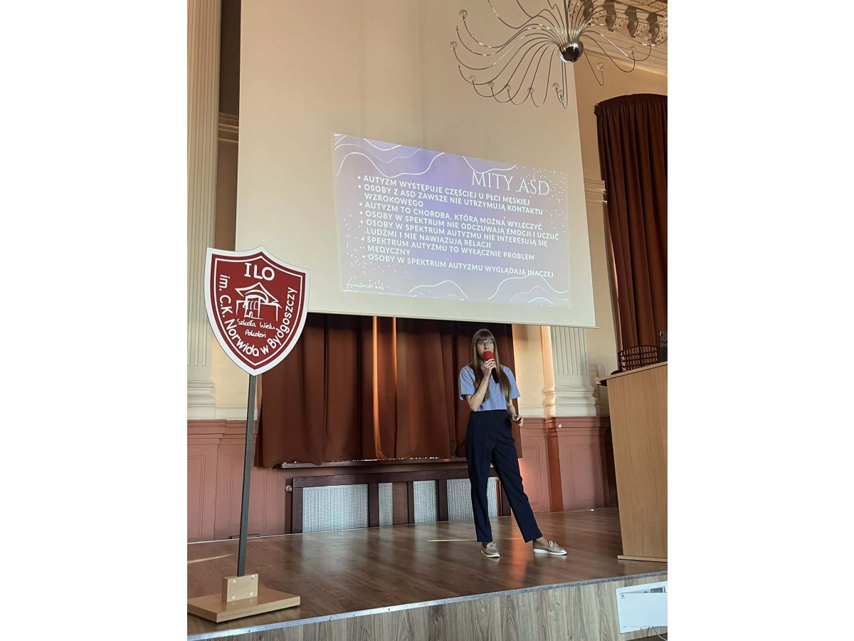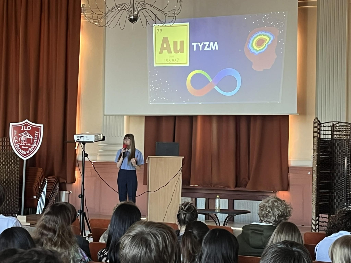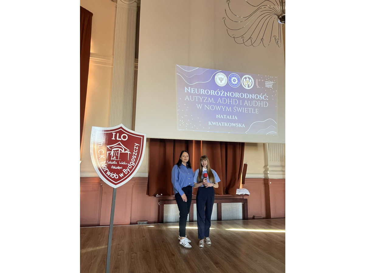 W dniu 1 kwietnia 2026 roku w I Liceum Ogólnokształcącym im. Cypriana Kamila Norwida z Oddziałami Dwujęzycznymi w Bydgoszczy odbył się wykład pt. „Neuroróżnorodność: autyzm, ADHD i AuDHD w nowym świetle”, skierowany do młodzieży szkolnej. Na zaproszenie pedagoga specjalnego Ewy Grześkowiak zajęcia poprowadziła Natalia Kwiatkowska – studentka III roku psychologii oraz przedstawicielka Studenckiego Koła Naukowego „Neuroróżnorodność” działającego przy Uniwersytet Kazimierza Wielkiego w Bydgoszczy.