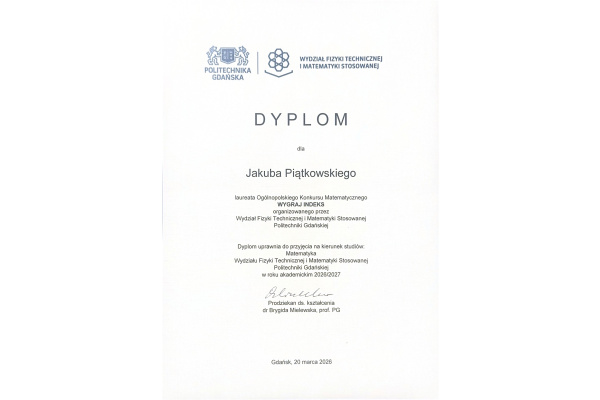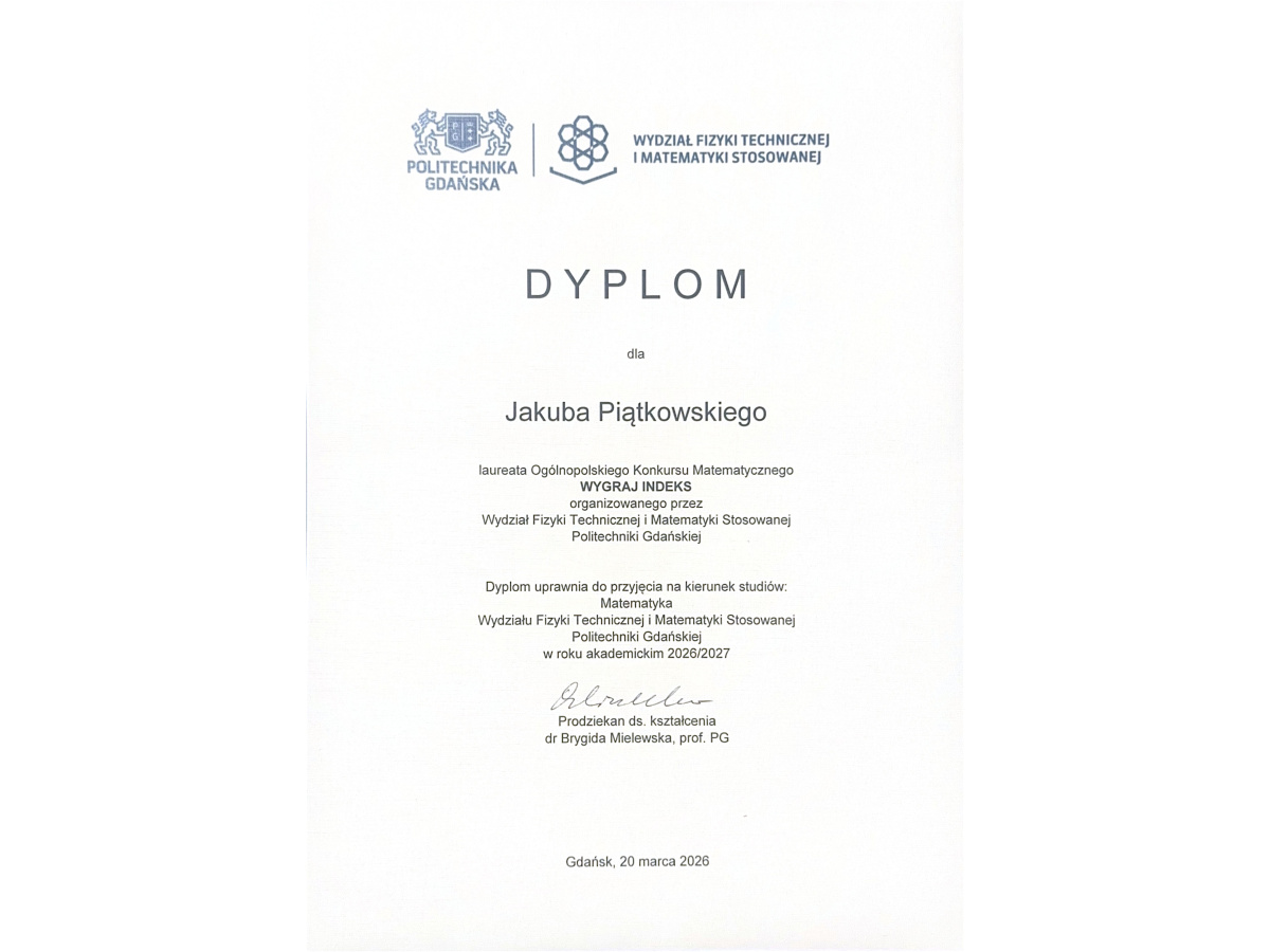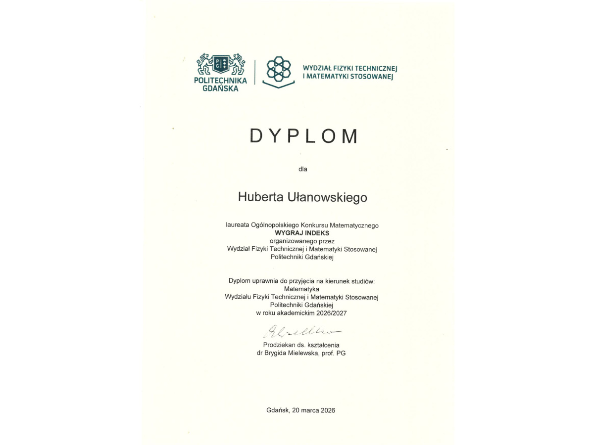Jakub Piątkowski i Hubert Ułanowski z klasy 4e zostali laureatami Ogólnopolskiego Konkursu Matematycznego "Wygraj Indeks" organizowanego przez Politechnikę Gdańską.
